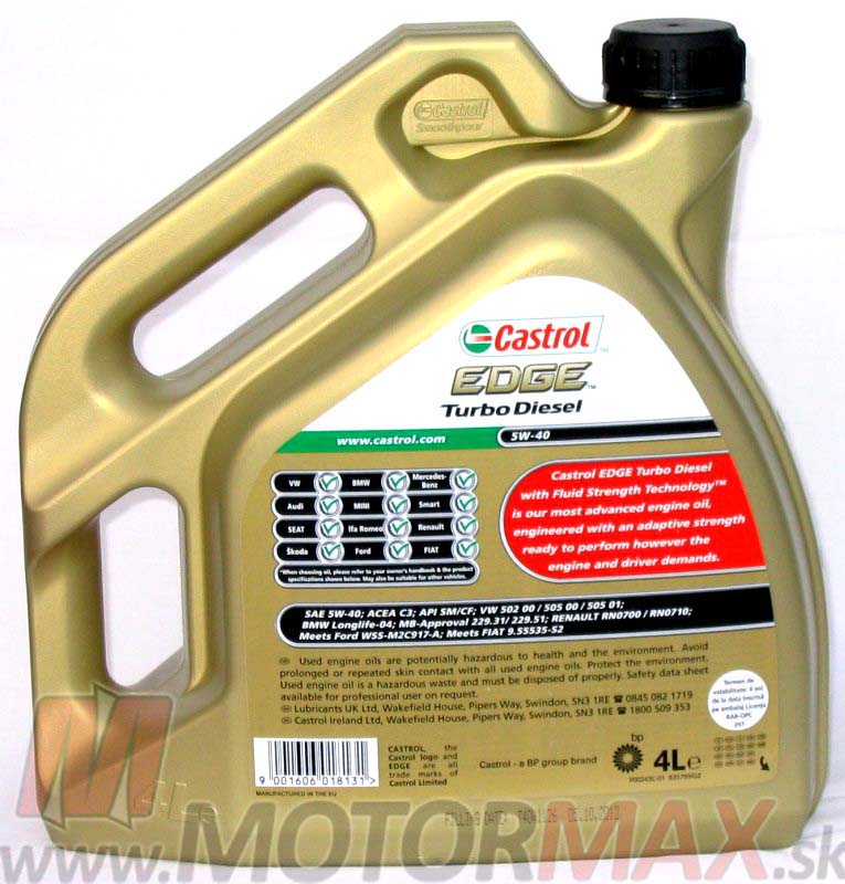 Castrol EDGE Turbo Diesel 5W40 je syntetický motorový olej s Fluid Strength Technology™ vhodný na použitie hlavne v preplňovaných naftových motoroch. Jeho zloženie poskytuje maximálnu výkonnosť a zároveň zabezpečuje kompatibilitu so systémami následnej úpravy výfukových plynov. Olej je obzvlášť vhodný pre vozy skupiny VW so systémom čerpadlo -tryska(PD) s pevným výmenným intervalom.