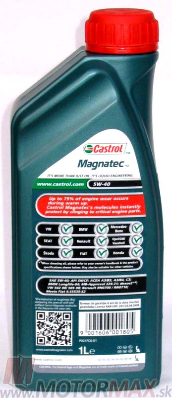 Castrol Magnatec 5W40 kombinuje „inteligentné“ molekuly so syntetickou technológiou zabezpečujúcou pevnejší mazací film. Tento syntetický motorový olej je vhodný pre benzínové motory, vrátane preplňovaných, s medzichladením a priamym vstrekovaním, i pre naftové motory s technológiou common rail vrátane filtra pevných častíc. Vďaka „ inteligentným“ molekulám poskytuje viac ochrany v kritickej fáze štartu a rozjazdu. Zaručuje vynikajúci výkon v extrémnych podmienkach studených štartov.