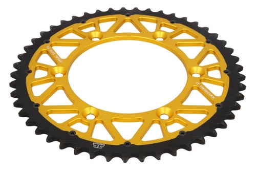 Zadná motocyklová reťazová rozeta (ozubené koleso). Zlato-čierna farba.